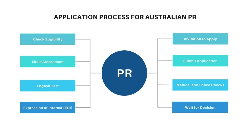 The application process involves checking eligibility, obtaining a positive skills assessment, submitting an Expression of Interest (EOI) through SkillSelect, receiving an invitation to apply, and then lodging the visa application along with required documents and fees.